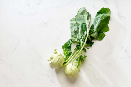 Flat lay with fresh raw kohlrabi on white background. New ideas for vegetarian cuisine concept