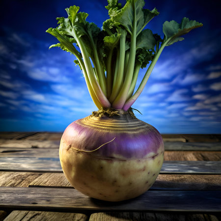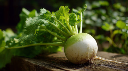 Fresh Turnip Vegetable with Green Leaves on a Rustic Wooden Surface