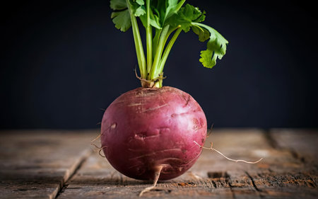 A close-up of a fresh purple radish with leaves, showcasing its vibrant color and natural beauty. Ideal for health, cooking, and gardening themes.