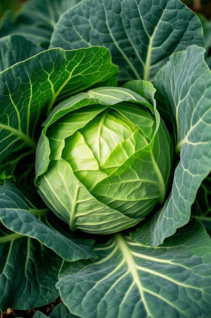 Lush garden embraces bright, leafy cabbages with richly textured foliage, symbolizing healthy growth and vibrant greenery in an outdoor vegetable patch.