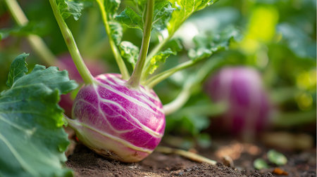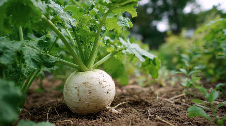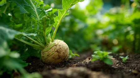 Fresh Turnip Growing in Soil with Green Leaves and Roots Visible