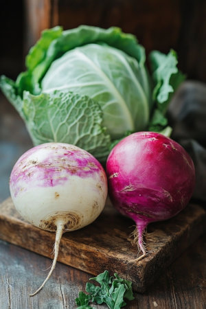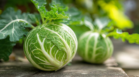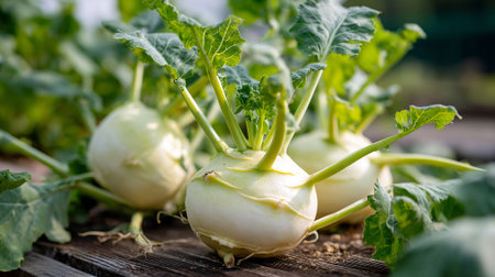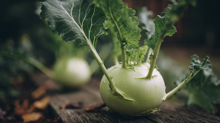 Whole organic kohlrabi on a rustic surface, fresh and ready for creative vegetable dishes.
