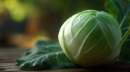 Fresh Green Cabbage Head Resting on a Wooden Surface With Leaf
