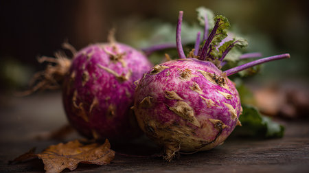 Vibrant purple kohlrabi, fresh from the garden, resting on rustic wood