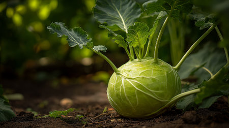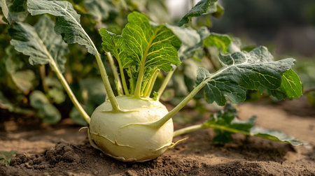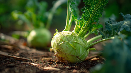 Fresh Organic Kohlrabi Growing in Garden Soil Under Bright Sunlight Conditions