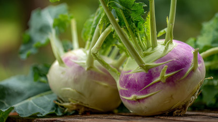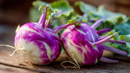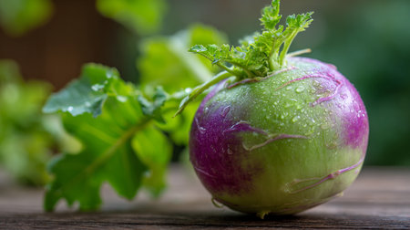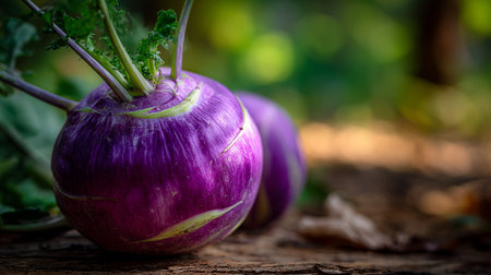 Fresh Purple Kohlrabi on Rustic Wood with Vibrant Green Leaves Background