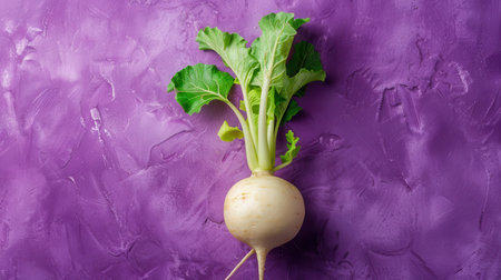 A single white turnip with green leaves sits on a textured purple background. The turnip appears fresh and ready to eat.
