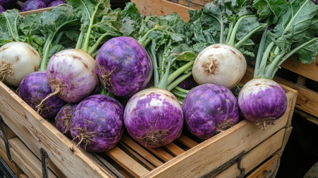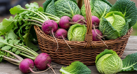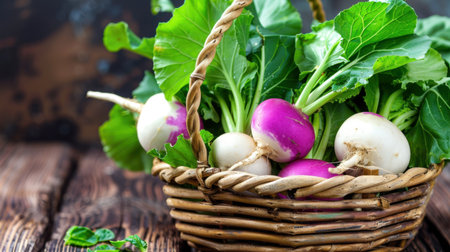 A basket filled with fresh turnips showcasing vibrant colors and green leaves on a rustic wooden surface. Perfect for illustrating healthy eating.