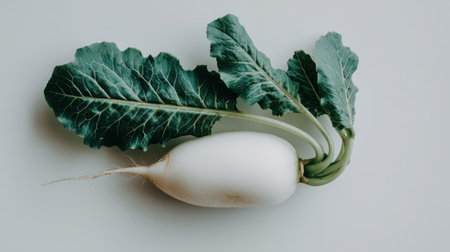 Discover the beauty of a fresh white radish with vibrant green leaves, perfect for enhancing culinary dishes and healthy diets.