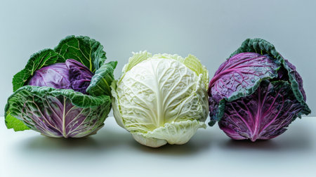 Three cabbage heads are shown, one of which is purple and the other two are white. Concept of freshness and health, as cabbage is a nutritious vegetable