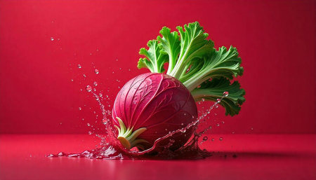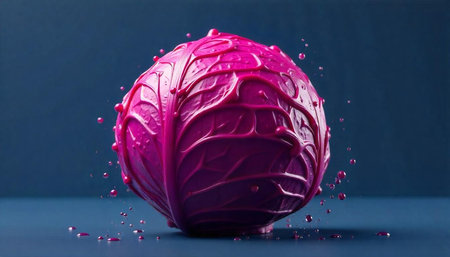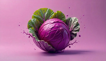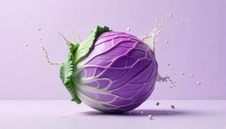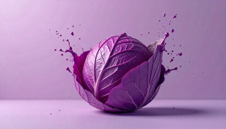 Monochromatic Red Cabbage Surrounded by Liquid Splash on Simple Background