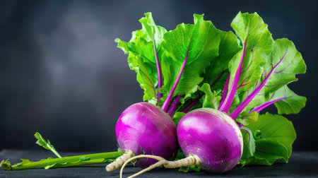 A captivating close-up of fresh purple daikon radishes with vibrant green leaves, showcasing their rich colors and organic appeal on a dark background.