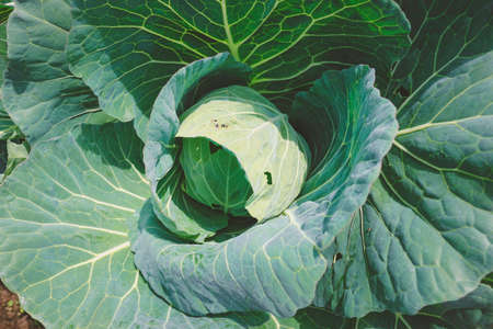 big cabbage in green leaves closeup beautiful healthy vegetable.