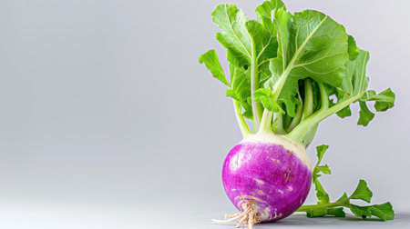 This image features a fresh purple turnip with vibrant green leaves on a neutral light gray background. Ideal for healthy eating or cooking themes.