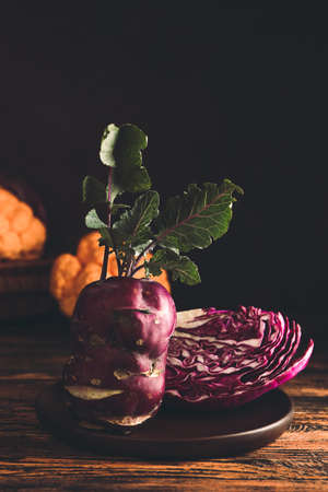 Purple organic fresh kohlrabi cabbage, summer harvest on brown kitchen table. selective focus