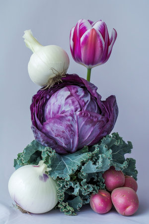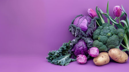 Fresh vegetables on a purple background, including green broccoli, purple cabbage, and potatoes with tulips
