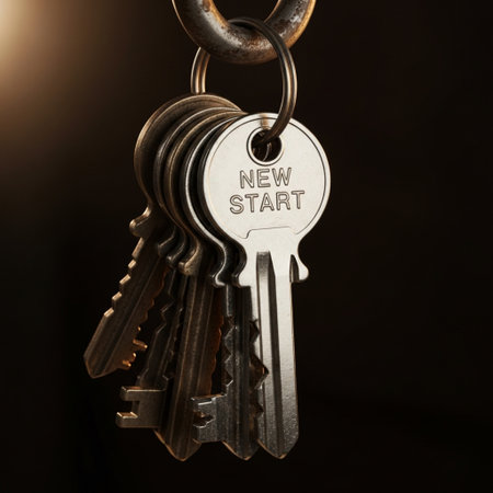 Closeup of bunch of keys on key ring with text new start