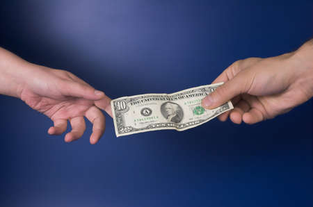 Hand giving dollar currency and hand take, over blue background. Giving money to help