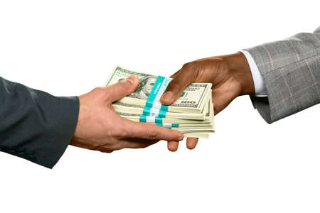 one person passes a stack of hundred dollar bills to another ,. High quality photo