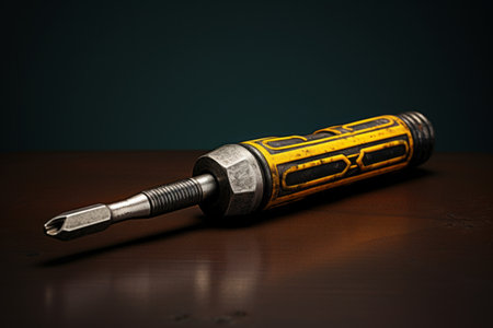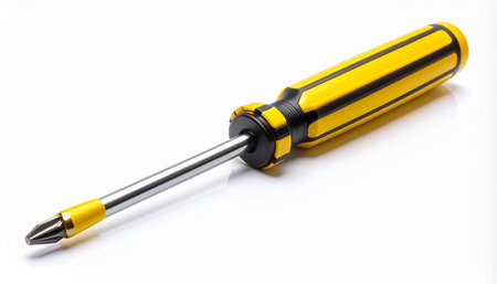 A yellow and black screwdriver with a metal Phillips head bit is shown on a white background, highlighting its construction and design.