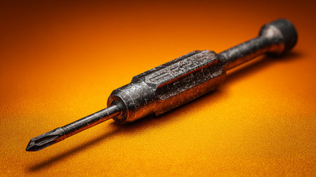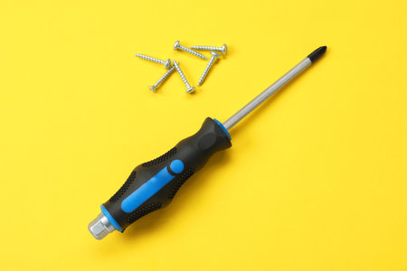 A vibrant yellow screwdriver rests on a textured surface, showcasing dust and small debris under natural light. This image illustrates tools and DIY repair themes.