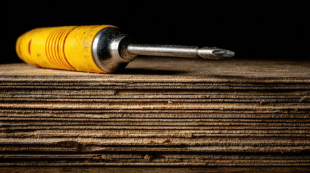 This close-up image features a yellow screwdriver resting on a stack of plywood, emphasizing the importance of tools in woodworking and home improvement projects.