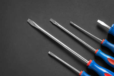 Top view and close up: Builder, repair and construction hand tool concept. There are screwdrivers on wooden table background.