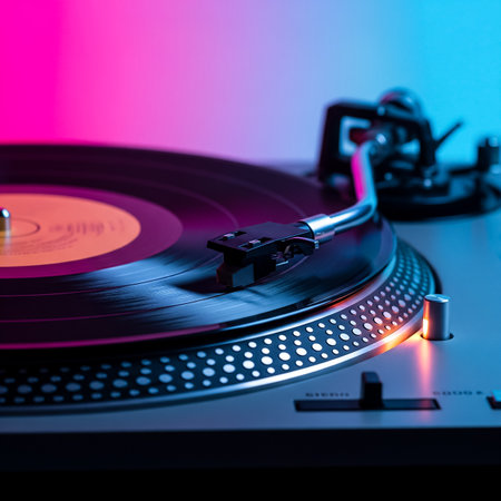 Turntable close-up featuring a spinning vinyl record, accented by vivid, dreamy bokeh lights in the background