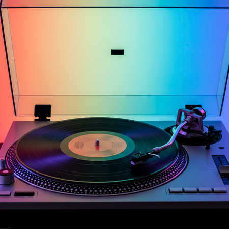 A vinyl record player spins a black record under vibrant, colorful lighting. This cozy setup highlights the retro appeal of analog music in a modern space, creating an inviting atmosphere.