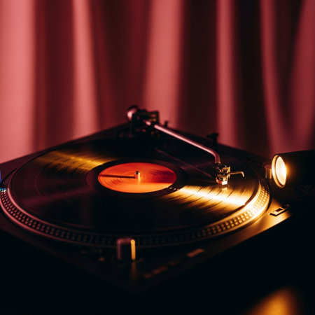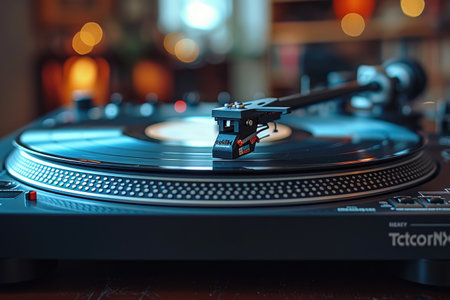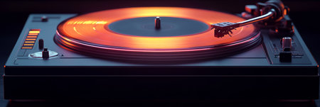 Close-up of a vintage turntable playing a vinyl record, highlighting sleek design and warm lighting, perfect for music lovers and retro enthusiasts.