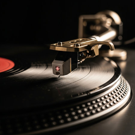 Close-up of a turntable playing vinyl record, capturing the essence of retro music