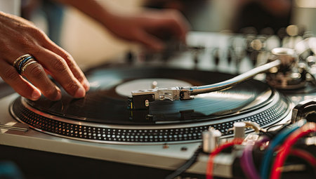 A close-up captures a person's hands manipulating a vinyl record on a turntable. The scene showcases a vintage or modern music setup, possibly indoors. The composition features shallow depth of field, with soft focus on some areas. This image is suited for illustrating music-related themes.