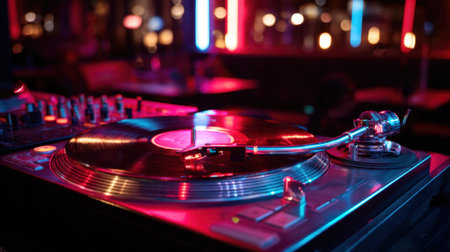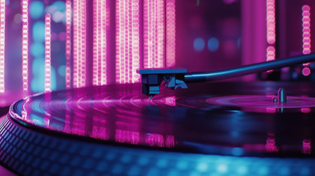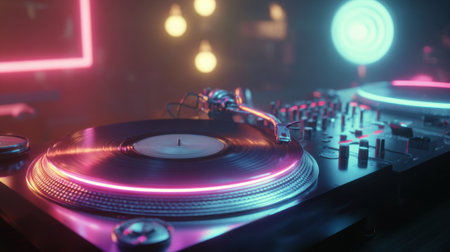 A turntable is spinning a vinyl record in a vibrant atmosphere filled with neon lights reflecting shades of pink and blue, creating an energetic mood perfect for music lovers.
