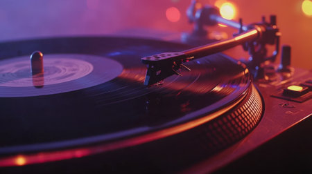 A vinyl record spins on a sleek turntable, with the stylus delicately poised over the grooves, filling the retro music studio with rich sound. Colorful lights illuminate the background, enhancing the nostalgic atmosphere.