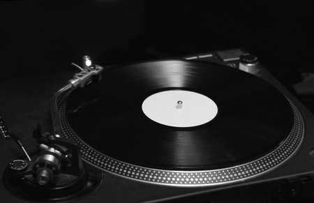 Record player stylus on a rotating disc, Picture of a vinyl record playing.