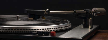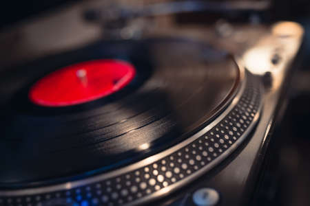 Close-up of modern turntable vinyl record player with music plate. Needle on a vinyl record. Concept of sound technology audio equipment