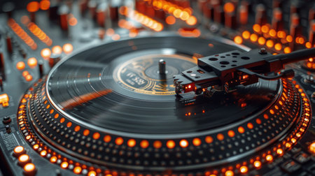 A close up of a record player with red lights shining on it, AI