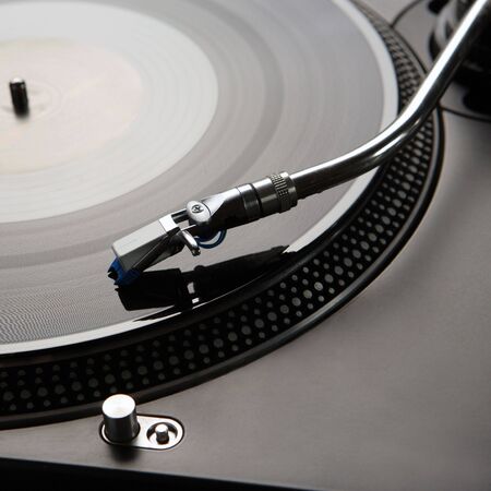 A retro-styled spinning record vinyl player.. Close up.