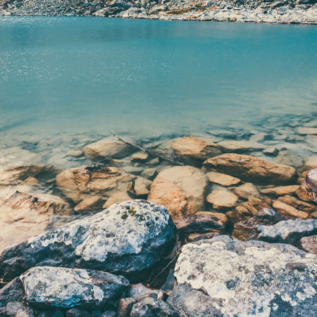 sea bay with stone shore, turquoise lake in rocks, mountain river with blue water