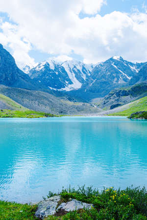 Beautiful mountain lake with clear turquoise water and high mountains in the background