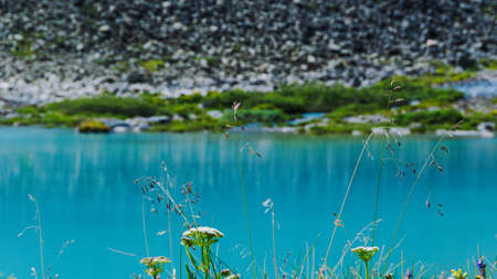Turquoise lake among mountain peaks. High mountain river on summer day, hiking on rocks and stones