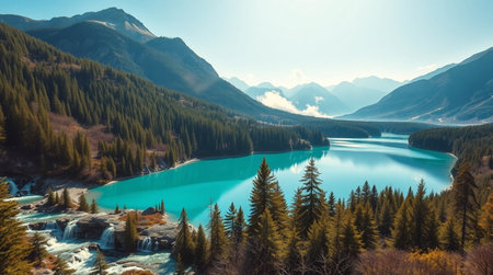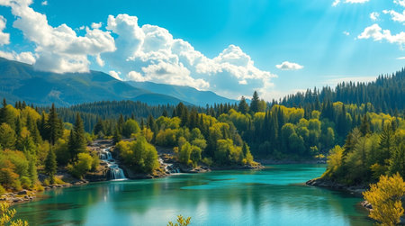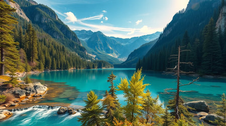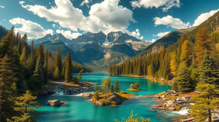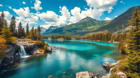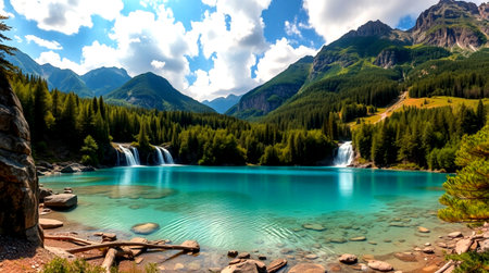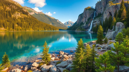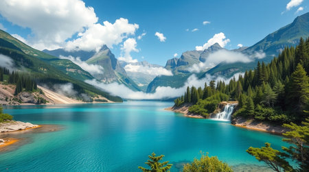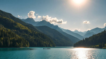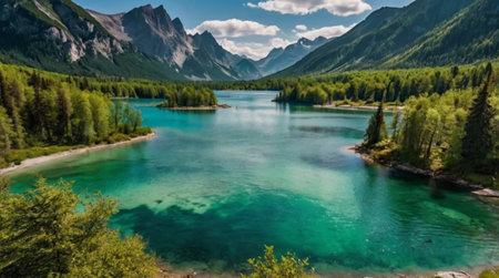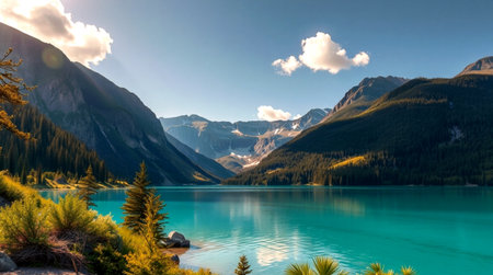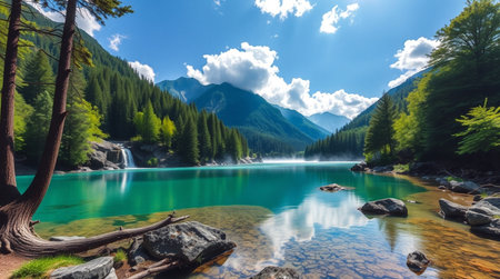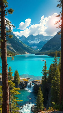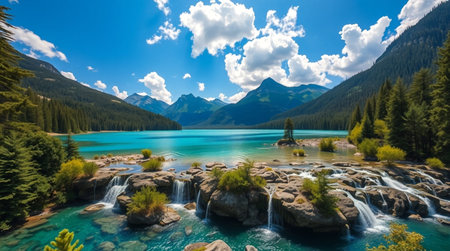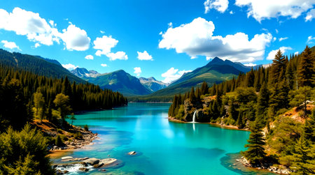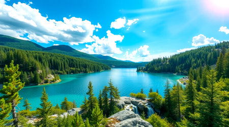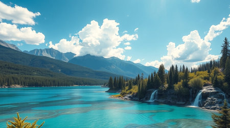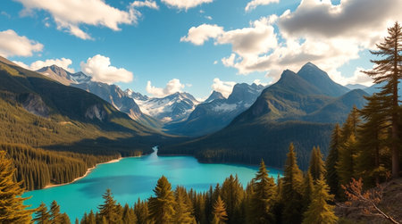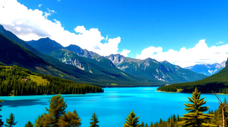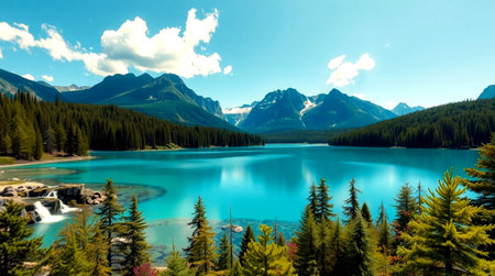 Experience the breathtaking beauty of a tranquil lake surrounded by towering mountains and lush pine trees, reflecting vibrant blue skies and fluffy clouds.