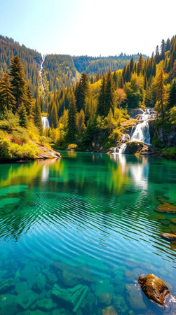 Beautiful mountain lake with clear turquoise water and autumn forest.