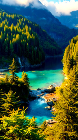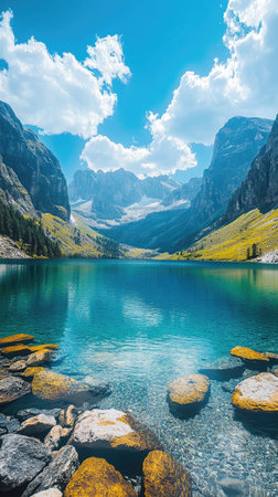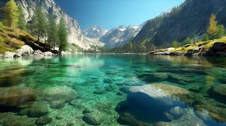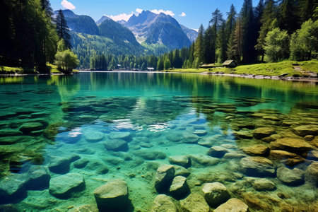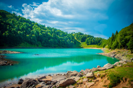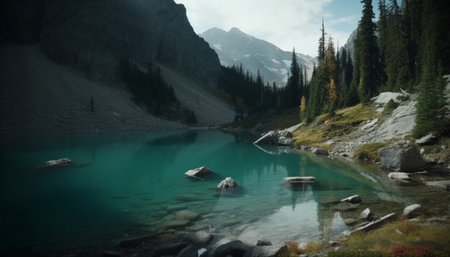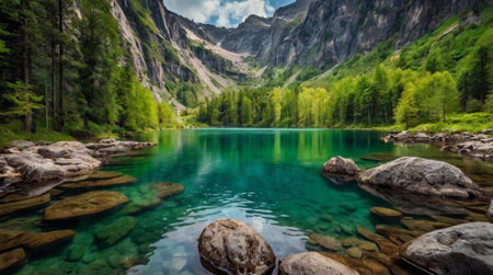 A vibrant landscape showcases a turquoise lake surrounded by towering mountains and lush green forests. The foreground features numerous rocks along the shoreline. The image displays a natural composition with soft lighting, suggesting an outdoor environment. This image is suitable for various commercial uses, including travel and environmental themes.