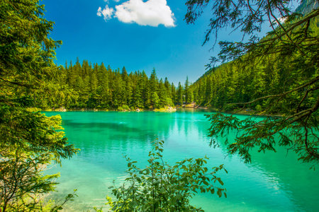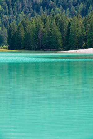 Beautiful mountain lake with turquoise water and coniferous forest.
