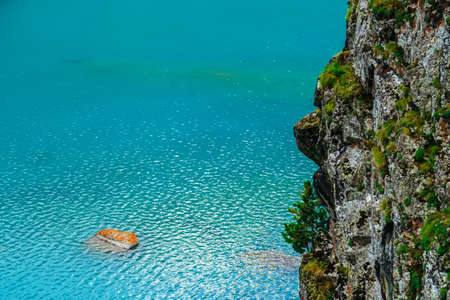 Orange mossy stone in azure mountain lake near large cliff with rich vegetation. Textured background of water surface near rock with copy space. Plants on mountainside. Greenery of highlands.