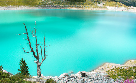 Panoramic view of turquoise lake in mountains. Sunny summer day.