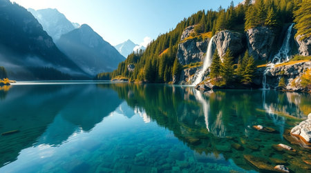 Beautiful alpine lake with clear water and waterfall in Dolomites, Italy