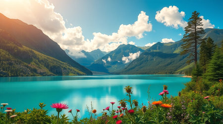 Mountain lake in the Alps with flowers and blue sky with clouds