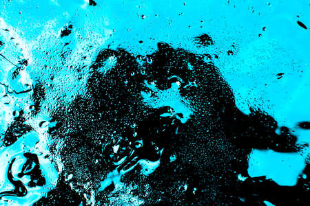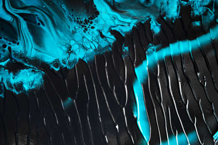Wet marble. Ink blend. Blur cyan blue black color glowing texture liquid acrylic emulsion flow wave dark abstract art background.